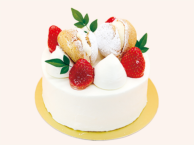 北海道産100%生クリームを使用。プチシューがのった、ふんわりショートケーキ。